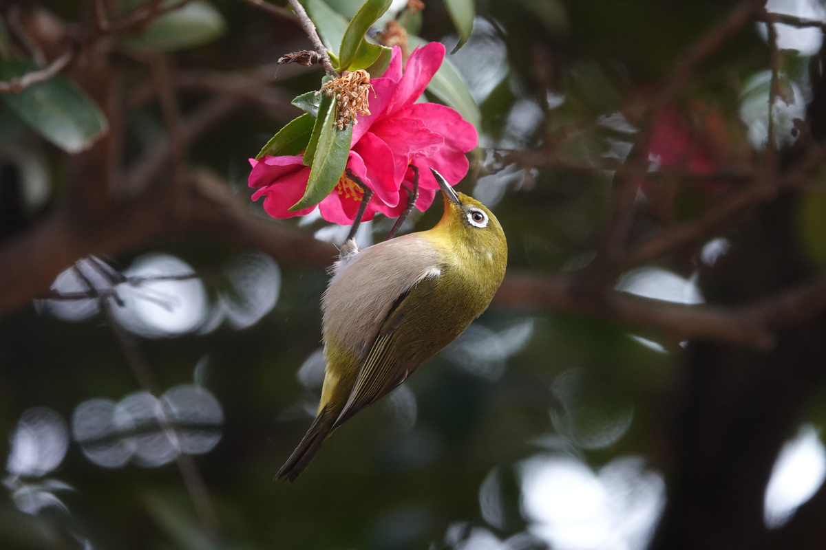 このところ、行けば必ず遊んでくれる山茶花のメジロ。ペアで、3〜4組。